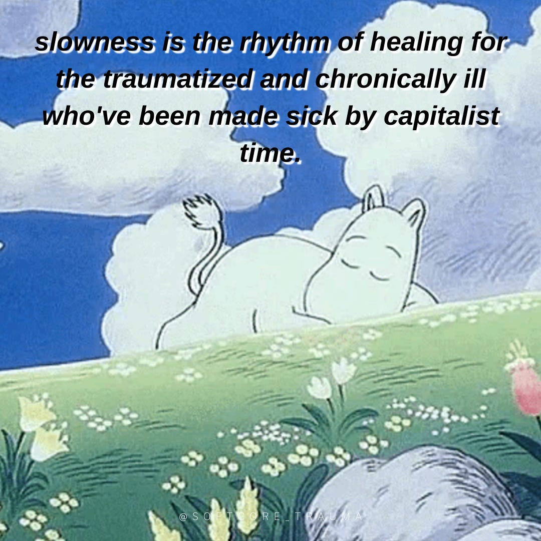 slowness is the rhythm of healing for the traumatized chronically ill bodymind that has been made sick by capitalist time.