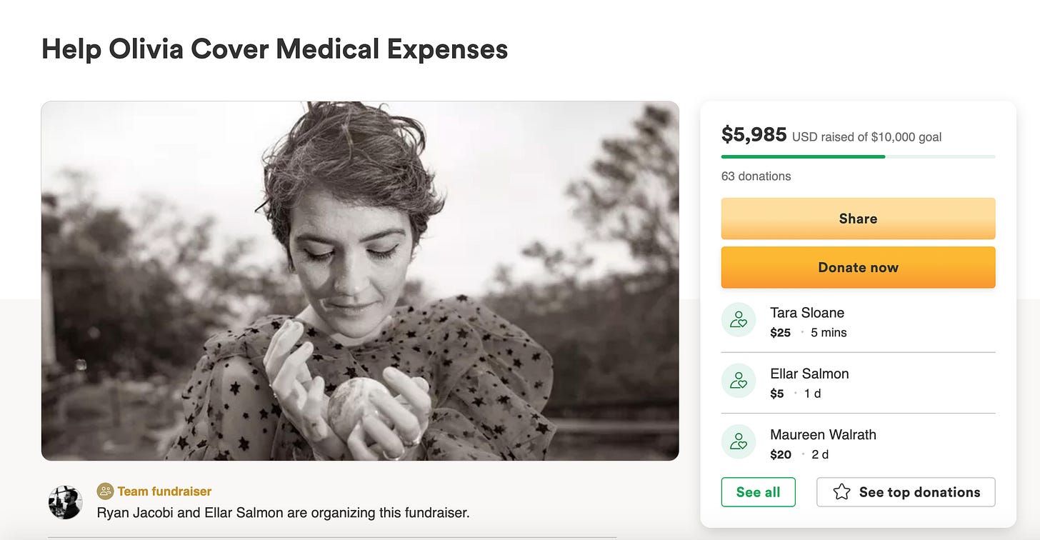 You might also know that Olivia has been dealing with a range of chronic health conditions for many years now. Due to the nightmare that we call capitalism and an ongoing public health crisis, they have been on a waitlist for six months, to receive extensive tests, in-network.