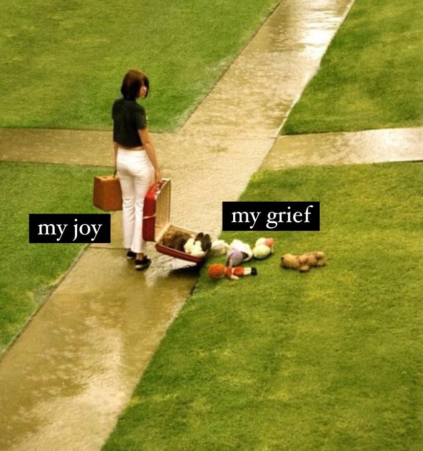 They say that grief opens the door to joy; in my experience joy also opens the door to grief. My chronic pain acts as the gatekeeper, trying to protect me from the tidal wave of grief that it believes will surely come if the portal opens. These are joy pains that I’m experiencing — my body’s manifestation of the psychic and emotional pain that is forced to the surface now that I’m living my best life.